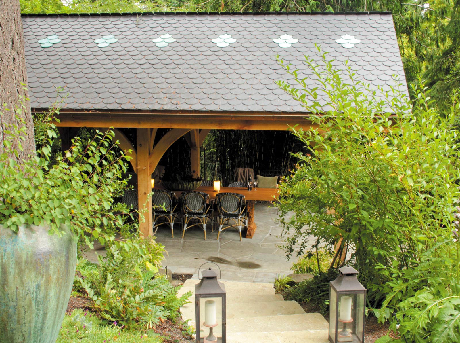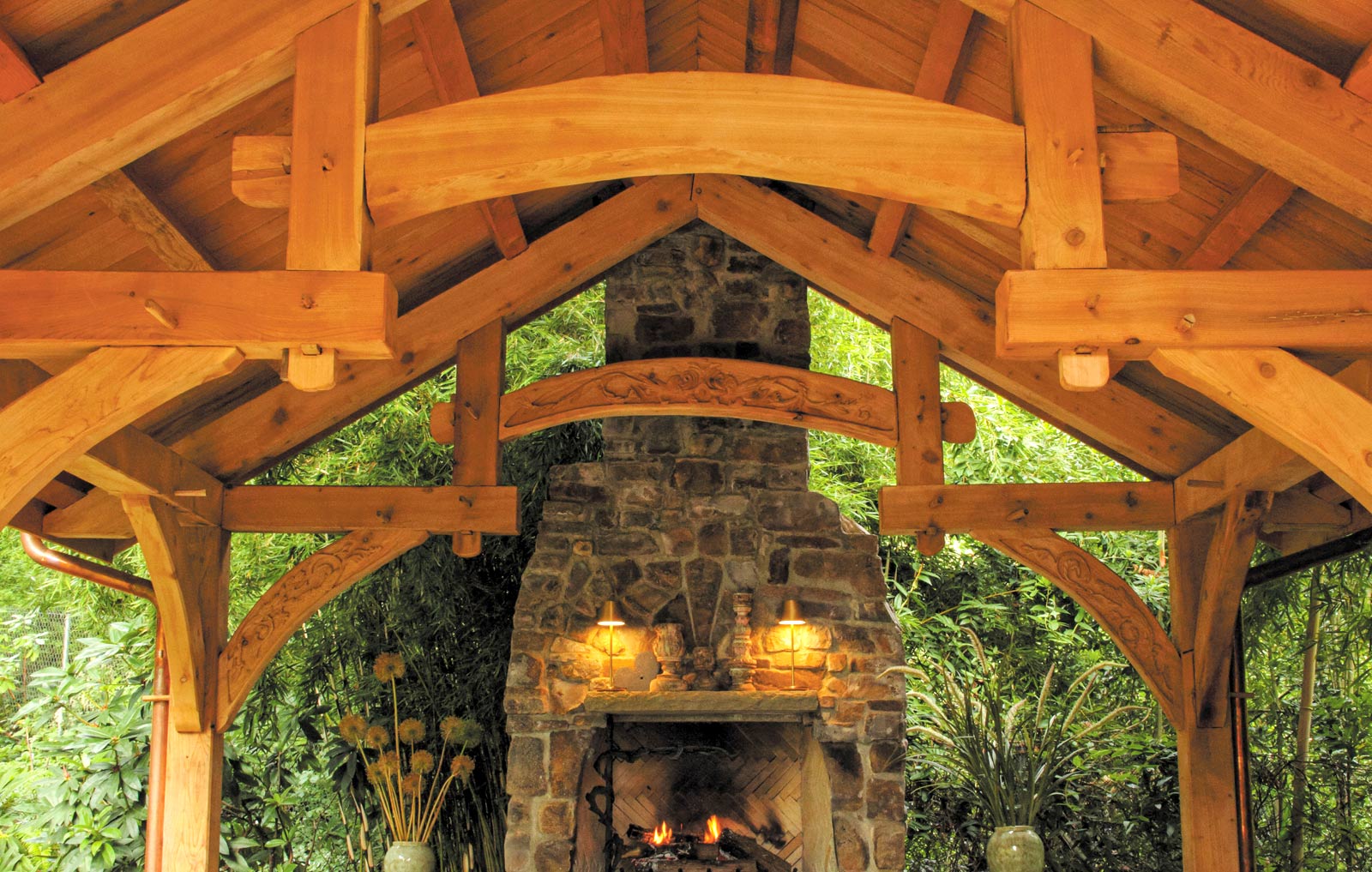 An existing gazebo didn’t feel grand enough. The Brindleys commissioned Tony Dattilo, a neighbor and friend who is a talented woodworker and owner of Dattilo Design/Build/Repair to build a structure compatible with the new fireplace.