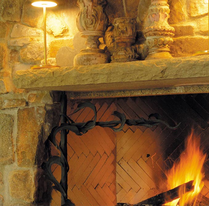 A swing arm (iron crane), welded by Gil Ramirez in California with an acanthus leaf motif, became a feature of the fireplace.
