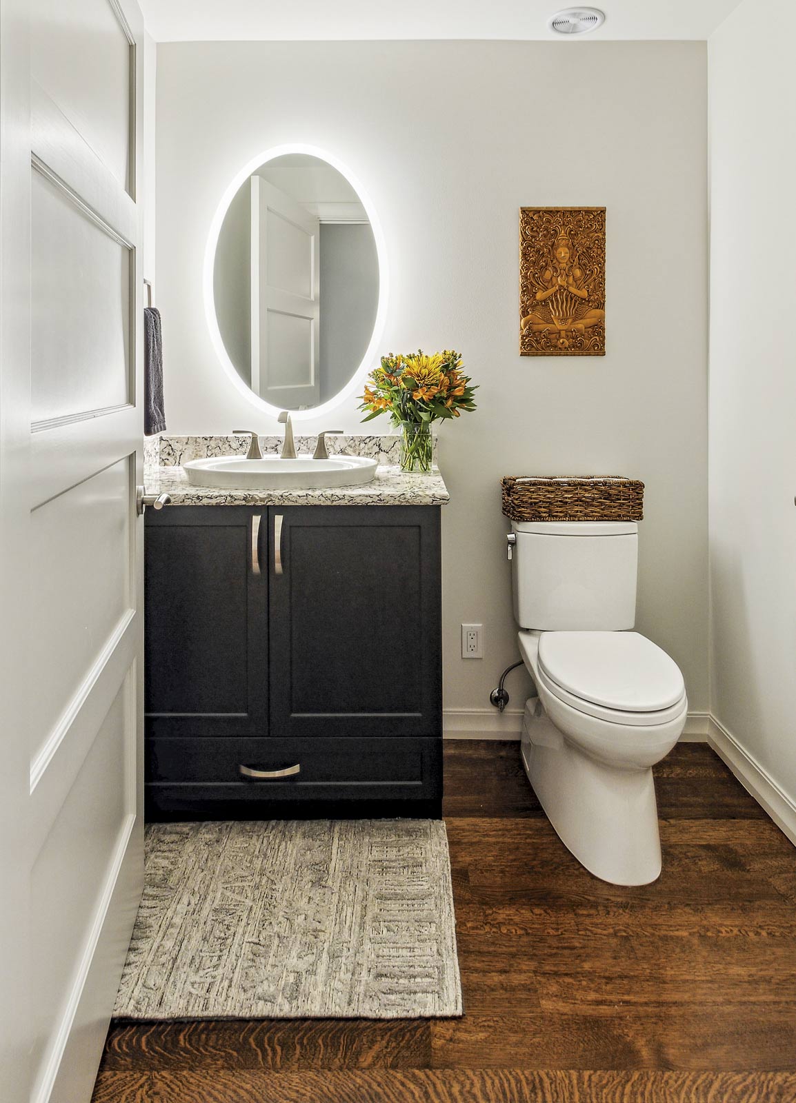 A powder room backlit LED mirror provides perfect all around illumination for guests. Design by McCabe By Design LLC (Photography courtesy Tammy Dwight) - Lighting undercabinet toe kicks or cabinet interiors with glass doors can render a beautiful glowing effect, helping set the desired mood for the kitchen and making it easier to navigate. Cabinet drawer lighting provides homeowners with an enhanced ability to locate food products (reducing food waste) and prep tools with greater ease.