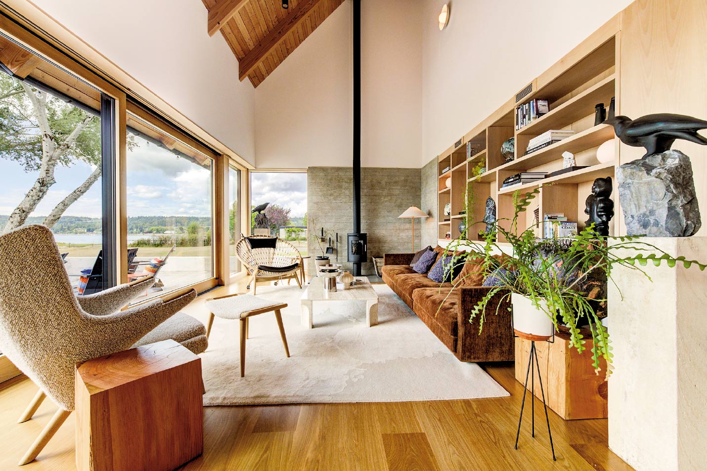 A light-filled space, even on the darkest days, greets you upon entry, and the generously sized rooms and voluminous ceilings provide a refreshing spaciousness. The light dances off the white-oak, 8-inch-wide, site-finished hardwoods and draws you into the views. Floor-to-ceiling, custom sliding doors expose the beauty of Dyes Inlet and mountain views. The two-story dining and living rooms feel cozy with the warm, custom-milled, fir-beamed ceilings. The visual interest of the view, mixtures of woods and concrete, and built-in display shelving create a moment of stopping to take it all in. A petite, Danish woodstove made by Morso offers additional comfort in cooler months. A small media room, located just off the main hallway, is a great place to watch a movie.