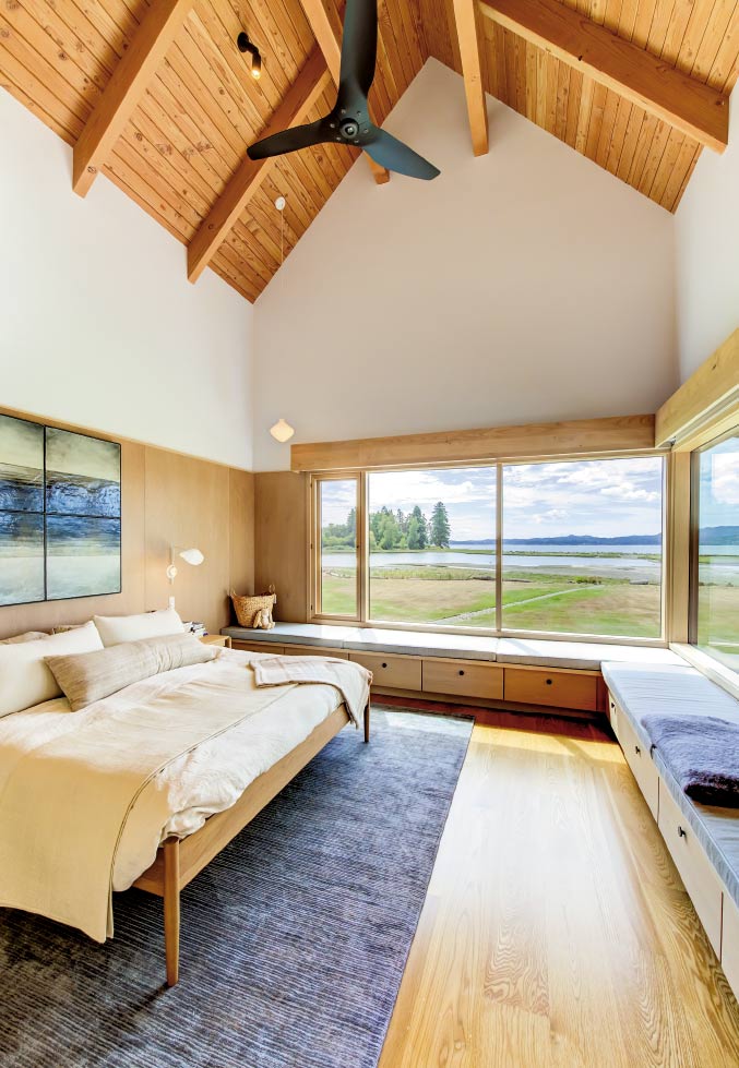 The sleeping areas of the home are separated, with guest rooms located at the back and the primary suite situated on the shoreline. The entire primary suite is separated from the home, with its own lengthy hallway and built-ins, a closet and primary bath. Two-story ceilings and more alder paneling with custom-built seating along both window walls frame the primary bedroom perfectly.