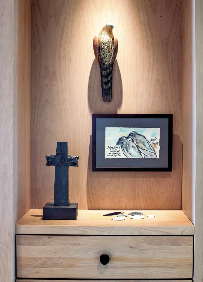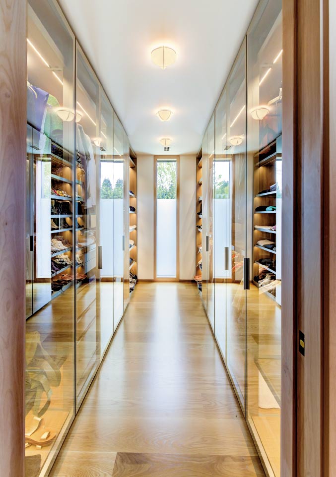 Designed to showcase the couple’s love of art, the home features lighted walls and spaces to display their numerous art finds. Custom cabinetry and shelving in the hallways, mudroom and living room could fill multiple homes, and provide ample storage for everything from collections to off-season clothing while creating a sleek, minimalist appeal.