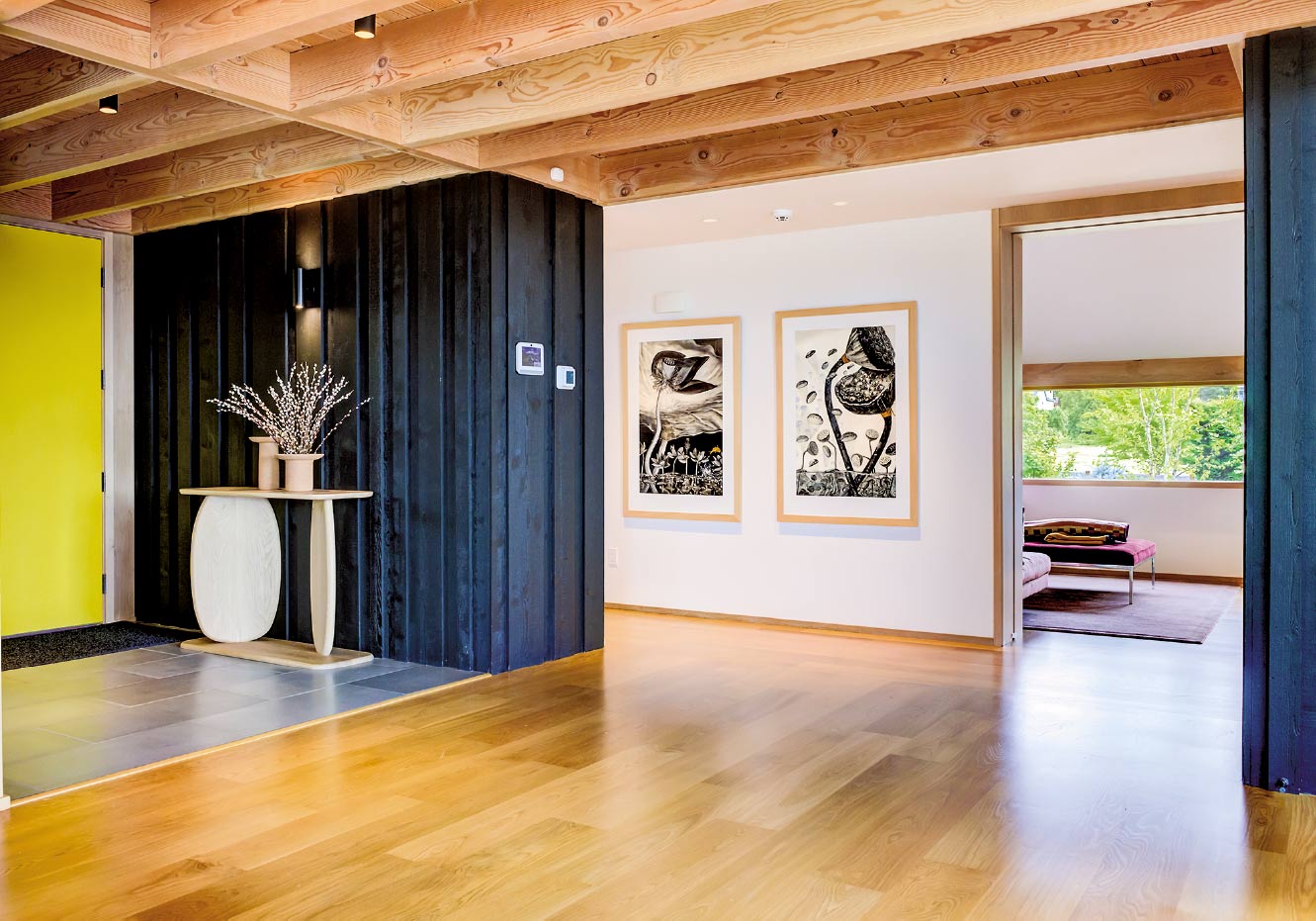 Each detail of the home, from the foundation up, was unique, unusual and often built to spec on or offsite. From the foundation and building frame to the hand-milled trim, select alder-paneled walls combined with finished and rough-textured concrete interior walls for contrast. Almost everything in the home was custom-fabricated.
