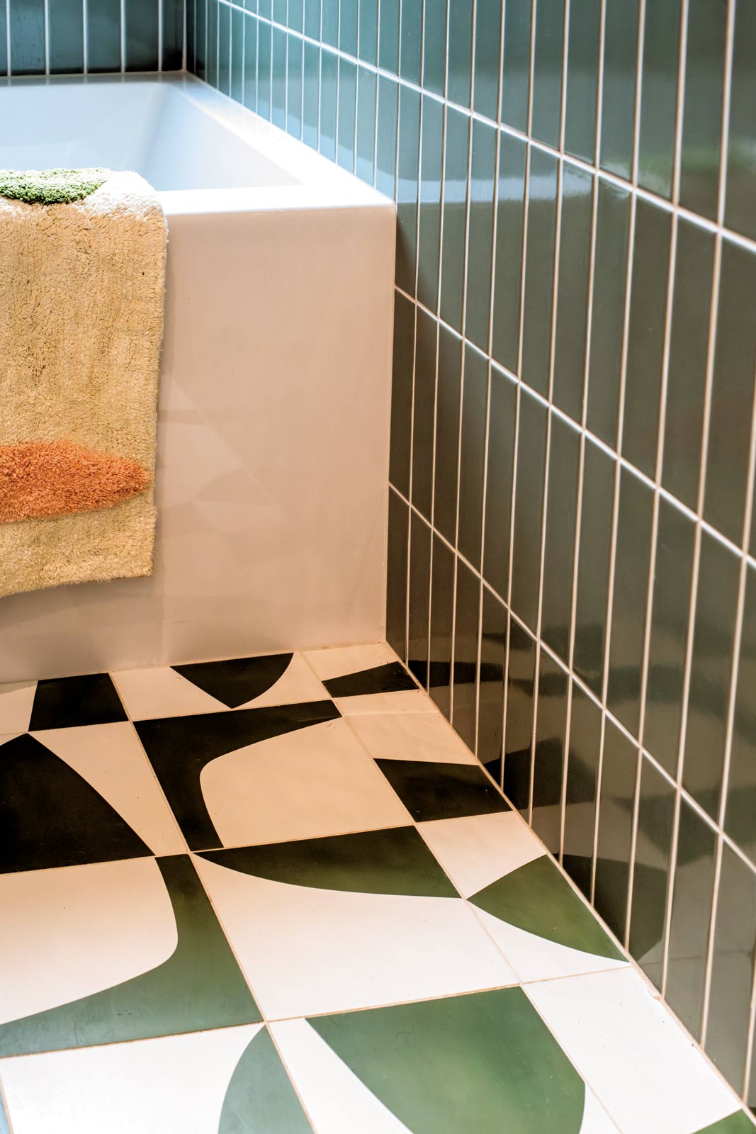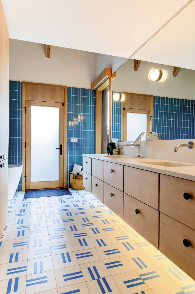 Color is showcased in the primary bath’s encaustic floor tiles and glazed wall tile in a refreshing blue, with a floating vanity, spacious freestanding tub and large shower, along with outdoor access to the private sauna, shower and cold plunge. Just past the bathroom is the luxurious primary closet, with glass doors and velvet-lined drawers from the luxury closet company Poliform.