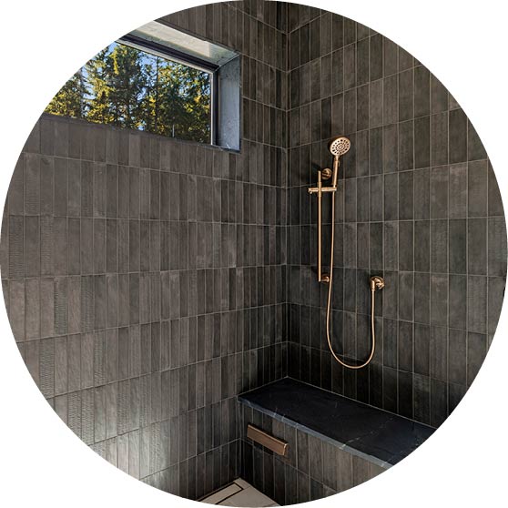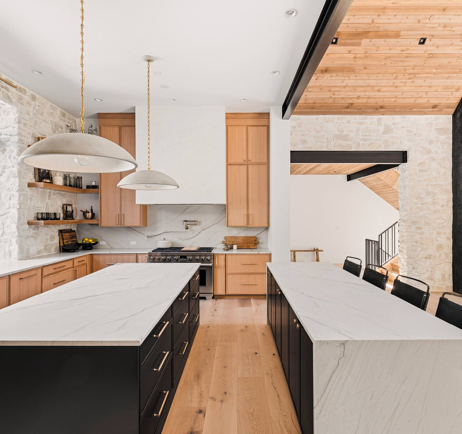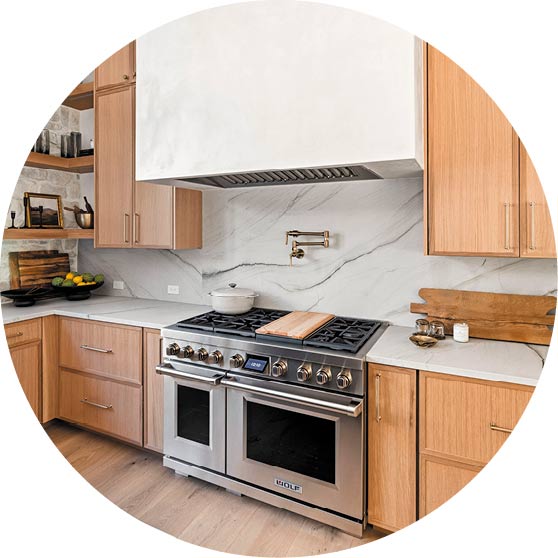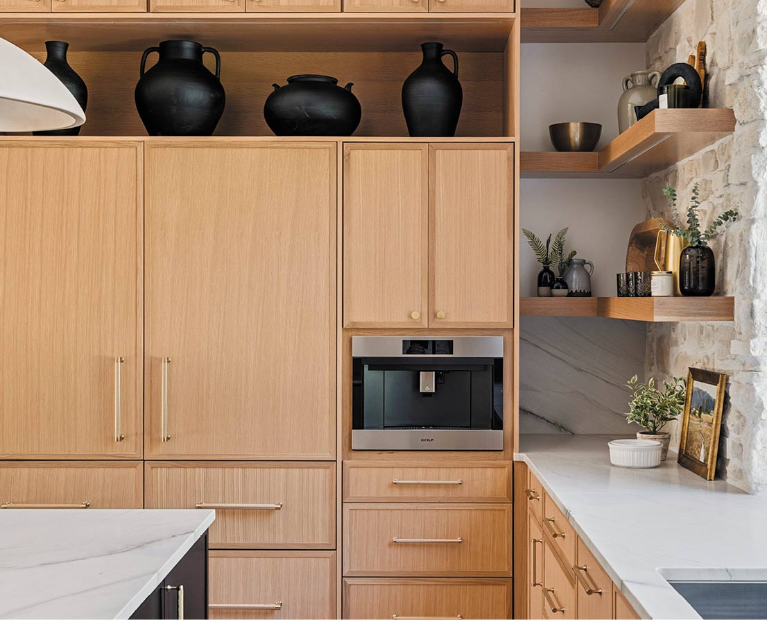 The homeowners moved in this fall and are enjoying their space’s functionality. “Even though we have only lived here a short amount of time, we have found some of our favorite spaces. If I had to choose one space, though, it would be the main living space — the kitchen, living room, dining room, and outdoor patio,” one homeowner said. “It is such a great space that feels so intimate but can entertain so many people. It has such a natural, peaceful feel about it with all the stone, wood, and natural light that comes in throughout the day. We start and end our days in these spaces, and a lot of time is spent here. In this particular space, you can truly see what is going on all around the house, inside and out.”