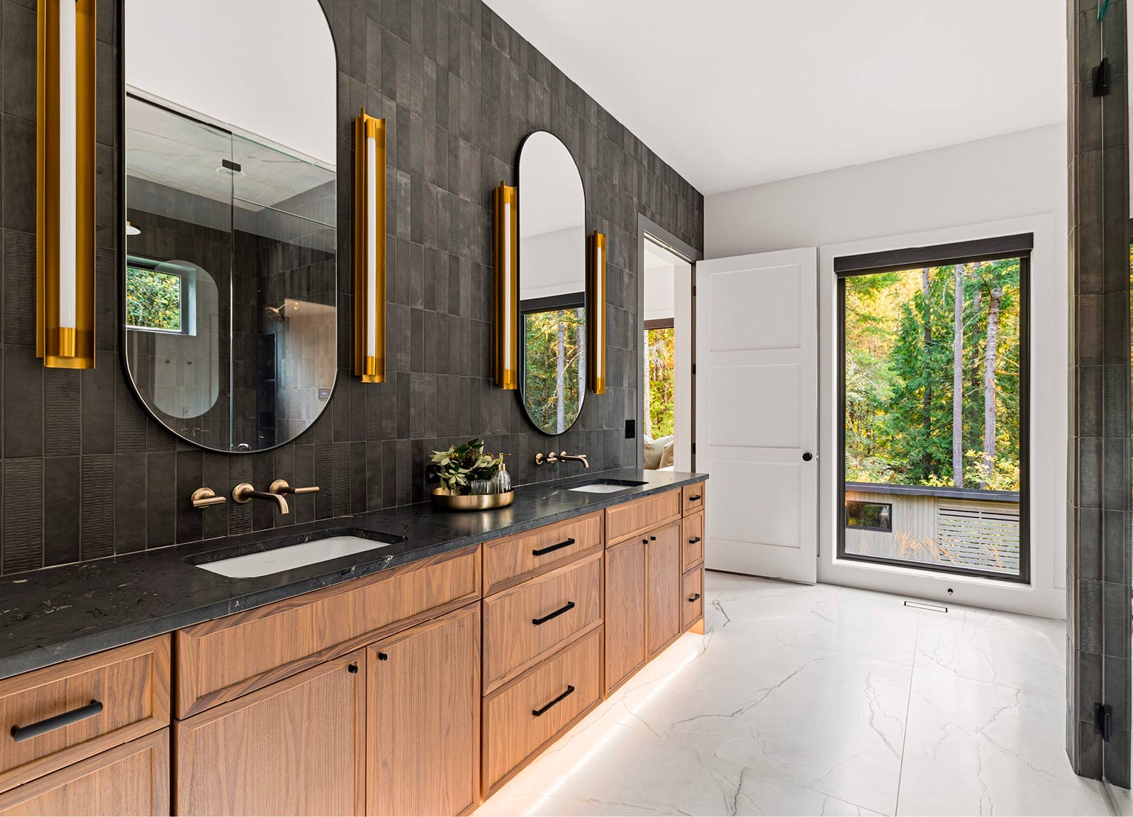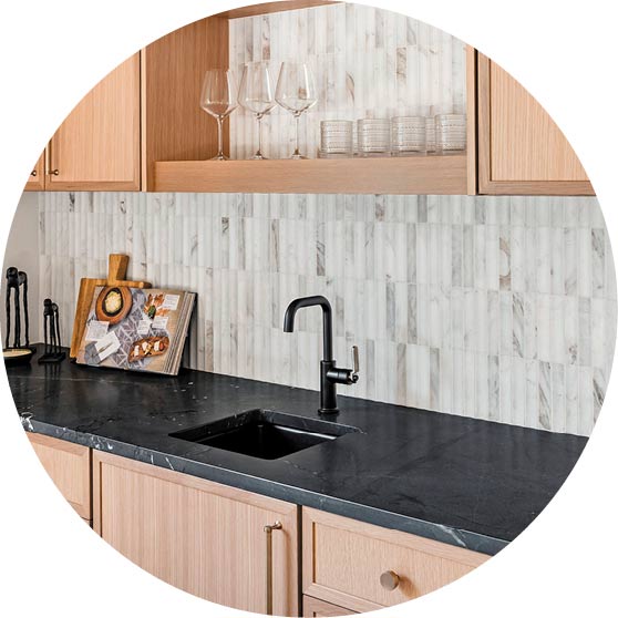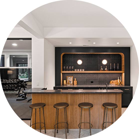 Interior designer Amber Zetterberg was inspired by the space, and enjoyed working with the homeowners. “From breaking ground to handing over the keys, this project was a lot of fun,” she said. Some of her favorite luxury features in the home are the Elkay filtered water bottle station, espresso maker, dual islands, steam shower, gym with a sauna, and the moody wet bar that feels kind of like a speakeasy.