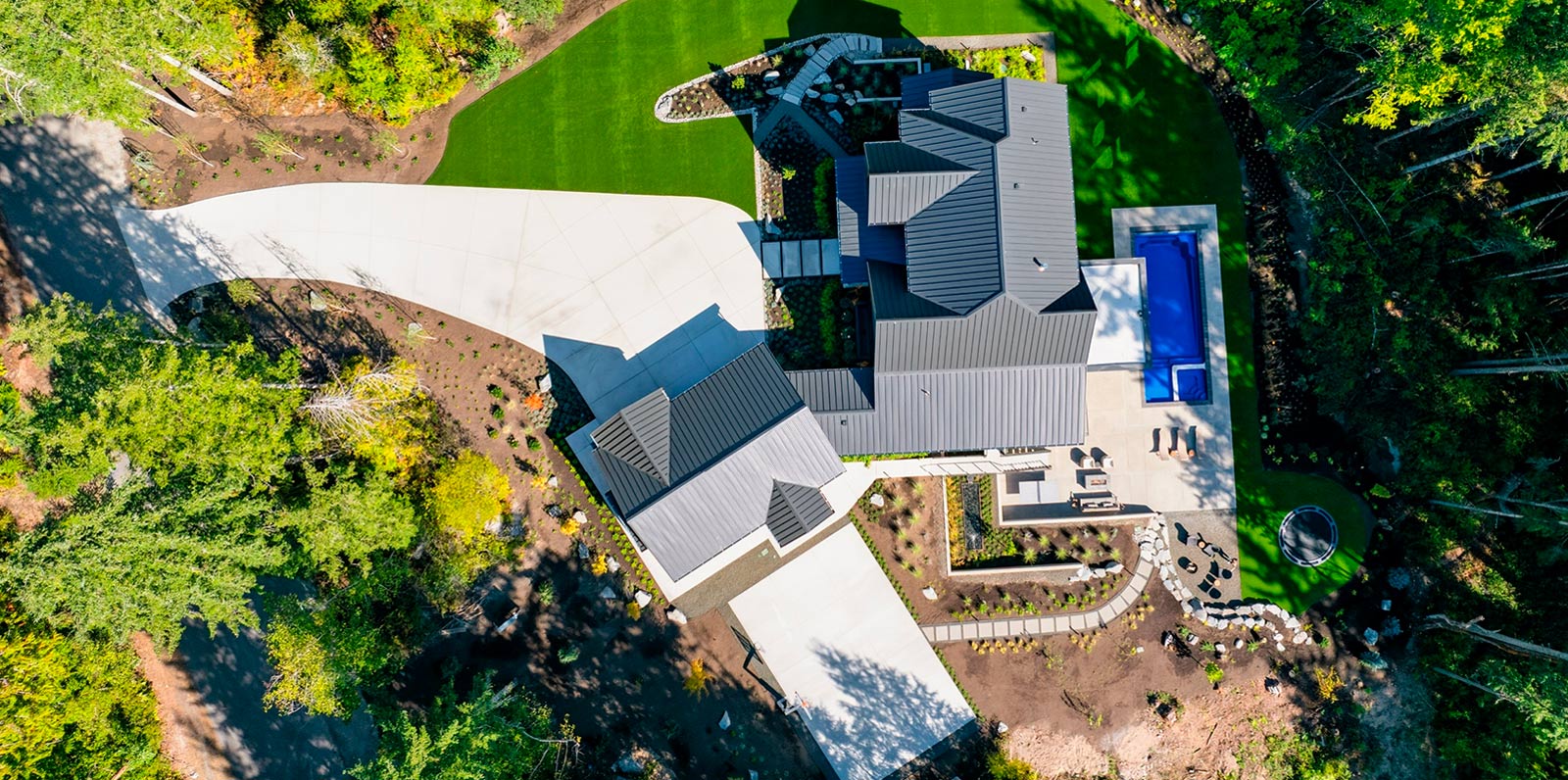 One could say they set out to build their forever home among a beautifully wooded backdrop along a quiet street. The home has a long driveway flanked by lovely native landscaping, realistic-looking artificial turf, and a massive, welcoming front door.