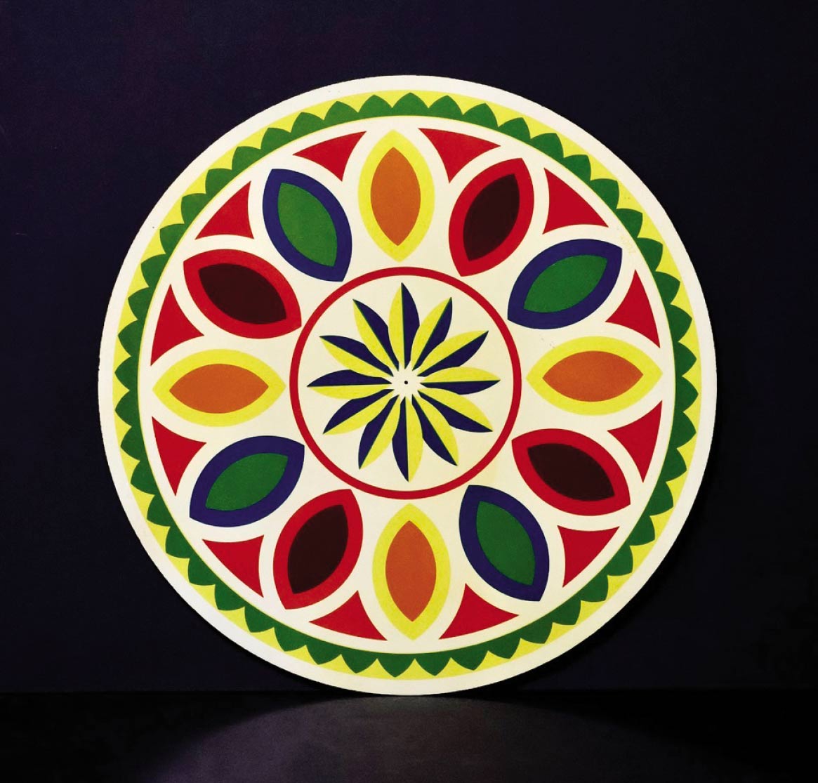 Research began; it is likely a 1970s Pennsylvania Dutch hex silkscreen, designed by Jacob Zook. In the early 1940s, Zook, of Pennsylvania, pioneered the hand silk screening of hex signs, according to the lancasterpa.com website. This allowed more hex signs to be made quickly and affordably. Hex signs often decorate barns still today in Pennsylvania Dutch Country and beyond. The many colors and symbols convey many meanings, such as luck or protection.